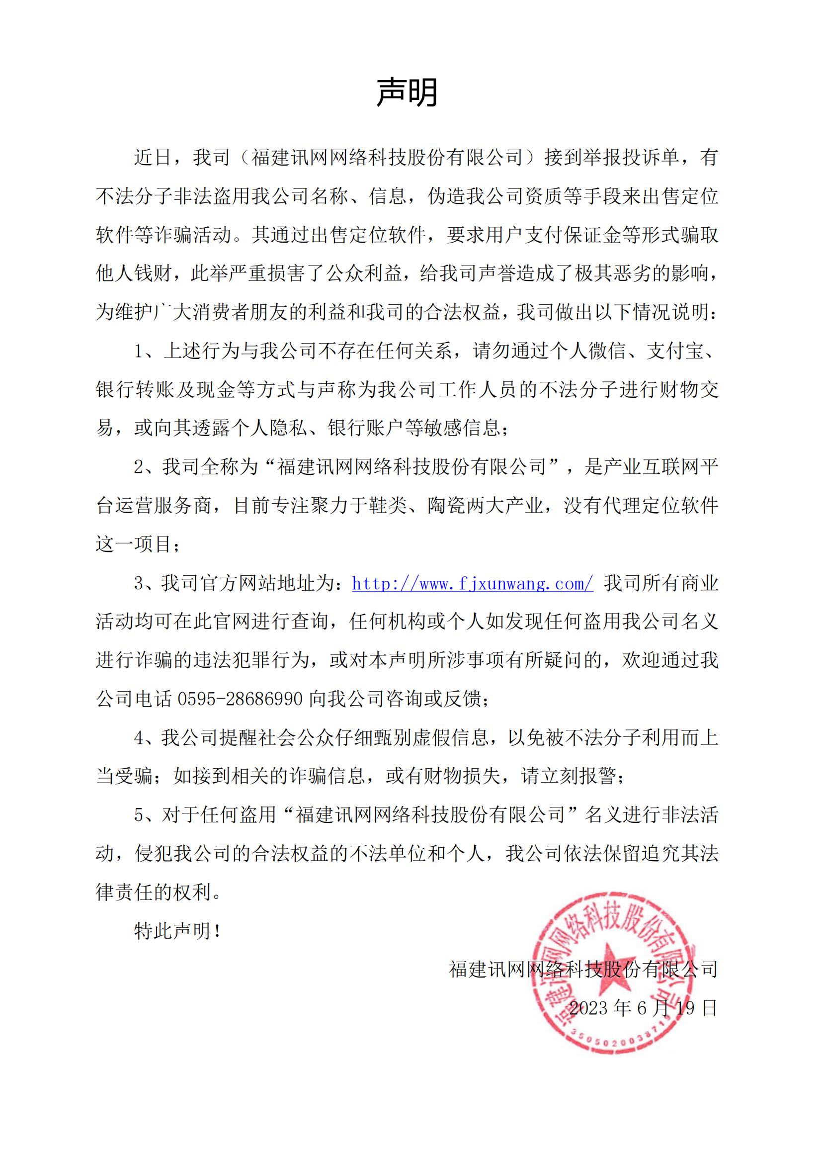 近日,我司(福建訊網(wǎng)網(wǎng)絡(luò)科技股份有限公司)接到舉報(bào)投訴單,有不法分子非法盜用我公司名稱、信息,偽造我公司資質(zhì)等手段來(lái)出售定位軟件等詐騙活動(dòng)。其通過(guò)出售定位軟件,要求用戶支付保證金等形式騙取他人錢財(cái),此舉嚴(yán)重?fù)p害了公眾利益,給我司聲譽(yù)造成了極其惡劣的影響,為維護(hù)廣大消費(fèi)者朋友的利益和我司的合法權(quán)益,我司做出以下情況說(shuō)明: