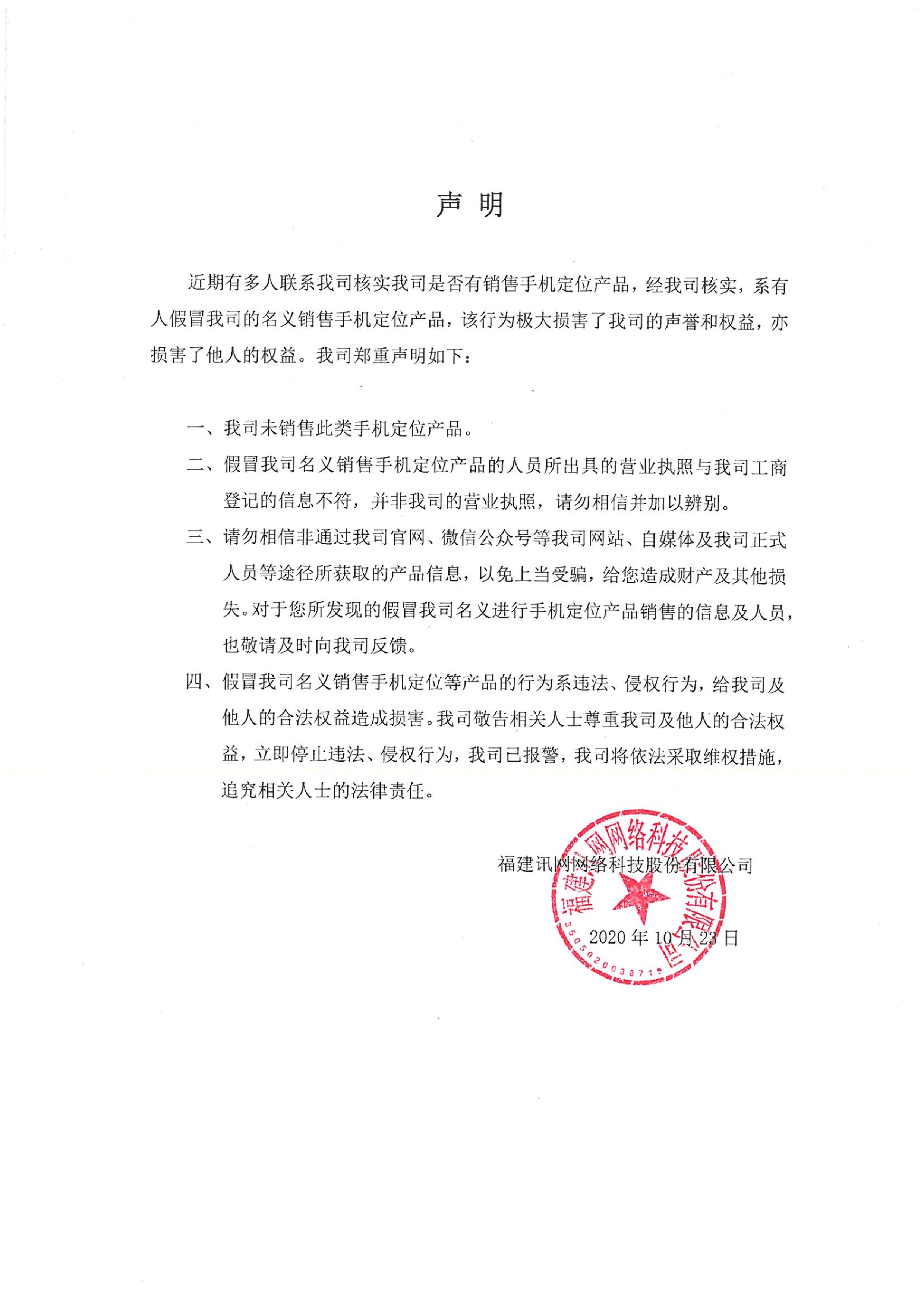 近期有多人聯系我司核實我司是否有銷售手機定位產品,經我司核實,系有人假冒我司的名義銷售手機定位產品,該行為極大損害了我司的聲譽和權益,亦損害了他人的權益。我司鄭重聲明如下: